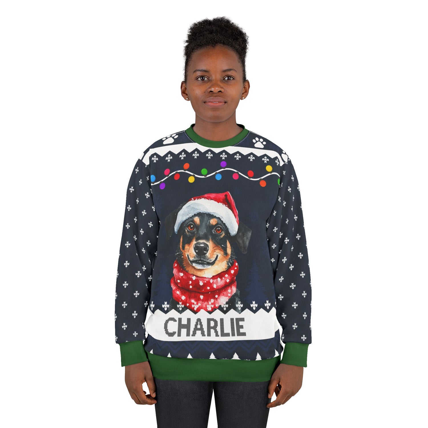 This cozy AOP (All-Over Print) sweatshirt features your dog’s portrait in a festive Santa hat, surrounded by colorful Christmas lights, snowflakes, and paw prints. Personalize it with your pet’s name — like “Charlie” — to make it truly one-of-a-kind.