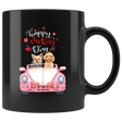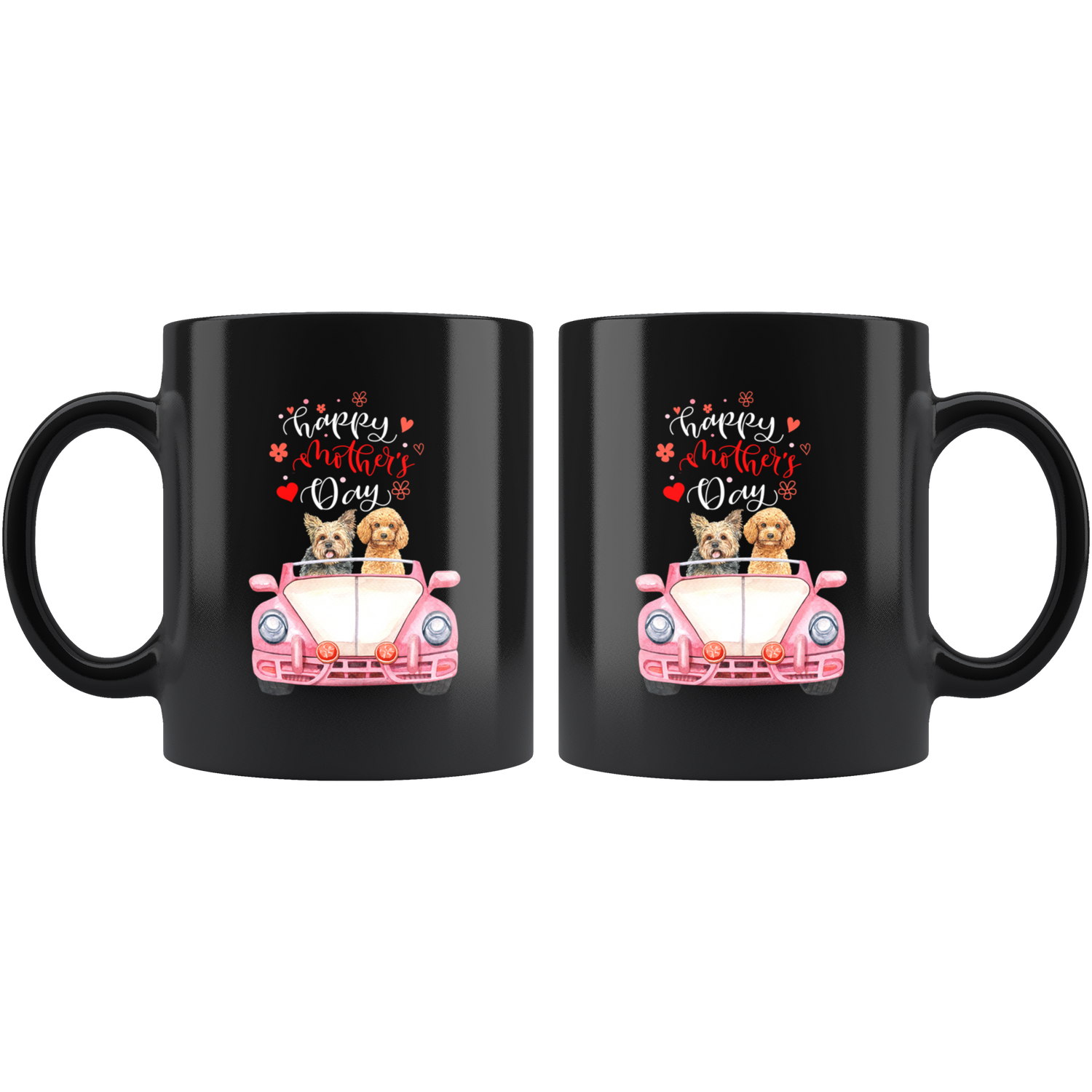 Happy Mothers Day Yorkie and Poodle in a Pink Car with the words "Happy Mother's Day", is a Cute Fun Black Ceramic Coffee Mug and a Great Fun Gift for Mom for Mother's Day.