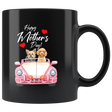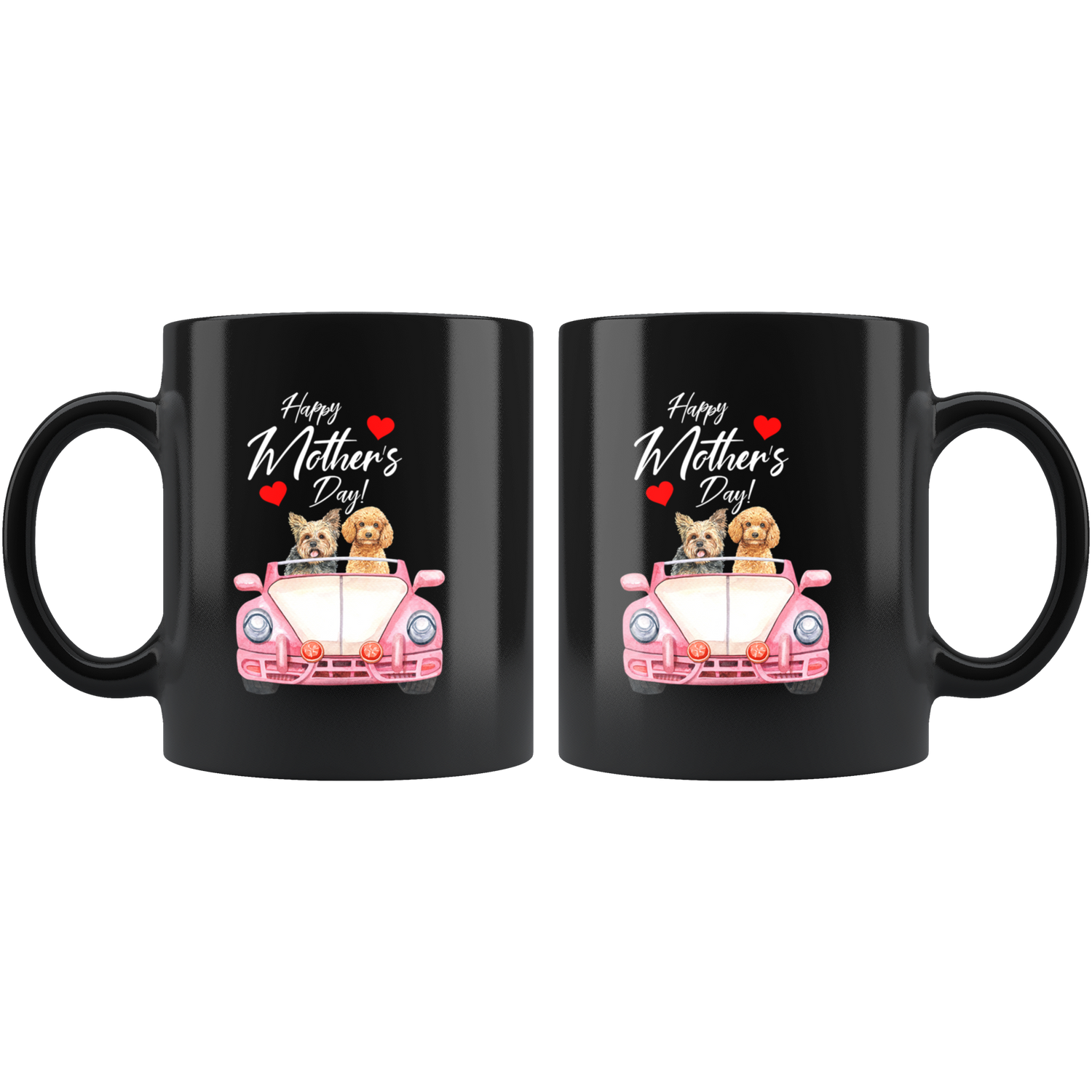 Happy Mothers Day Yorkie and Poodle in a Pink Car with the words "Happy Mother's Day", is a Cute Fun Black Ceramic Coffee Mug and a Great Fun Gift for Mom for Mother's Day.