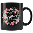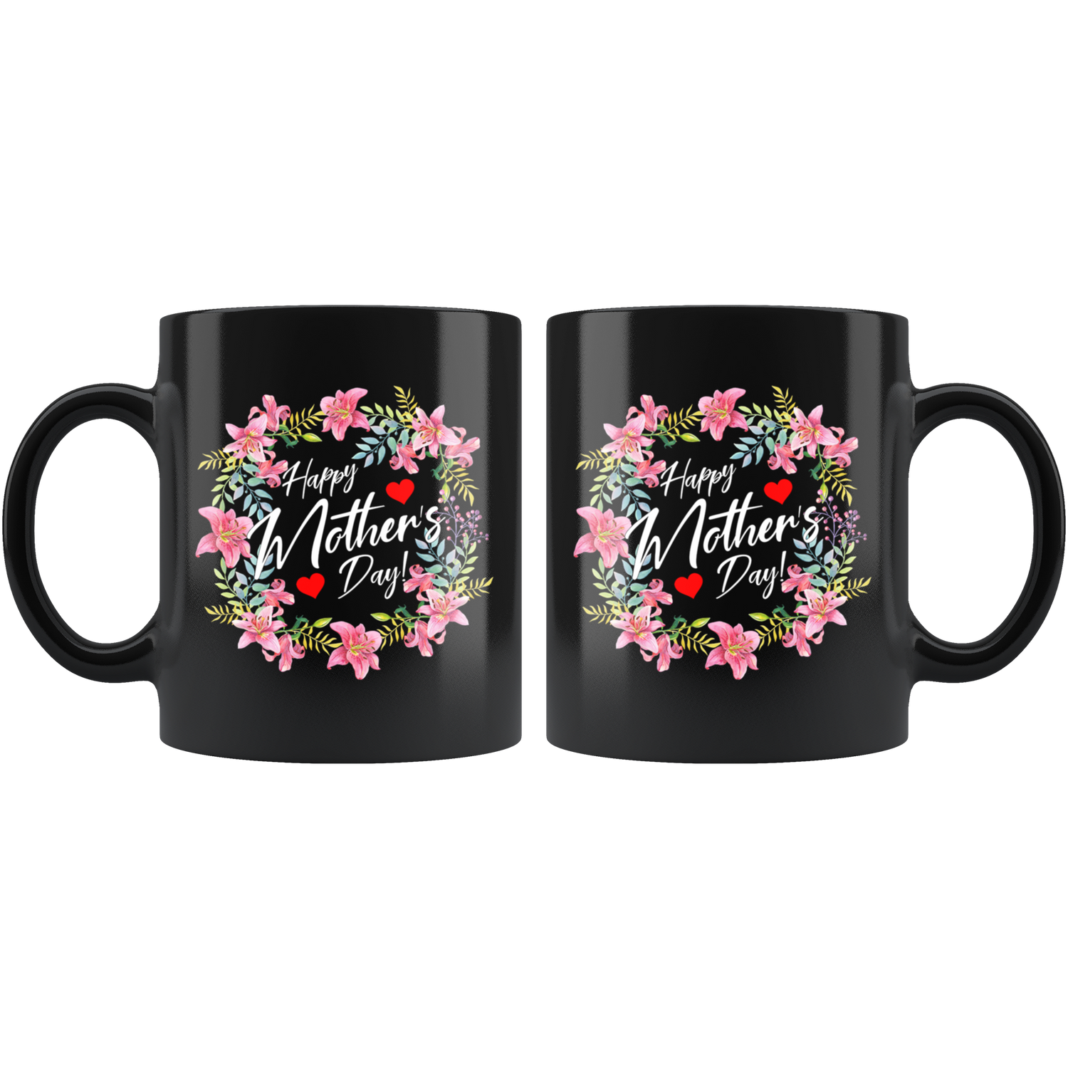 Happy Mother's Day in a Beautiful Flower Wreath is a Cute Fun Black Ceramic Coffee Mug and a Great Fun Gift for Mom for Mother's Day.