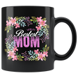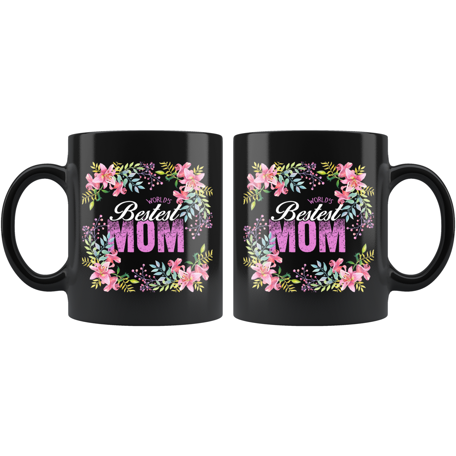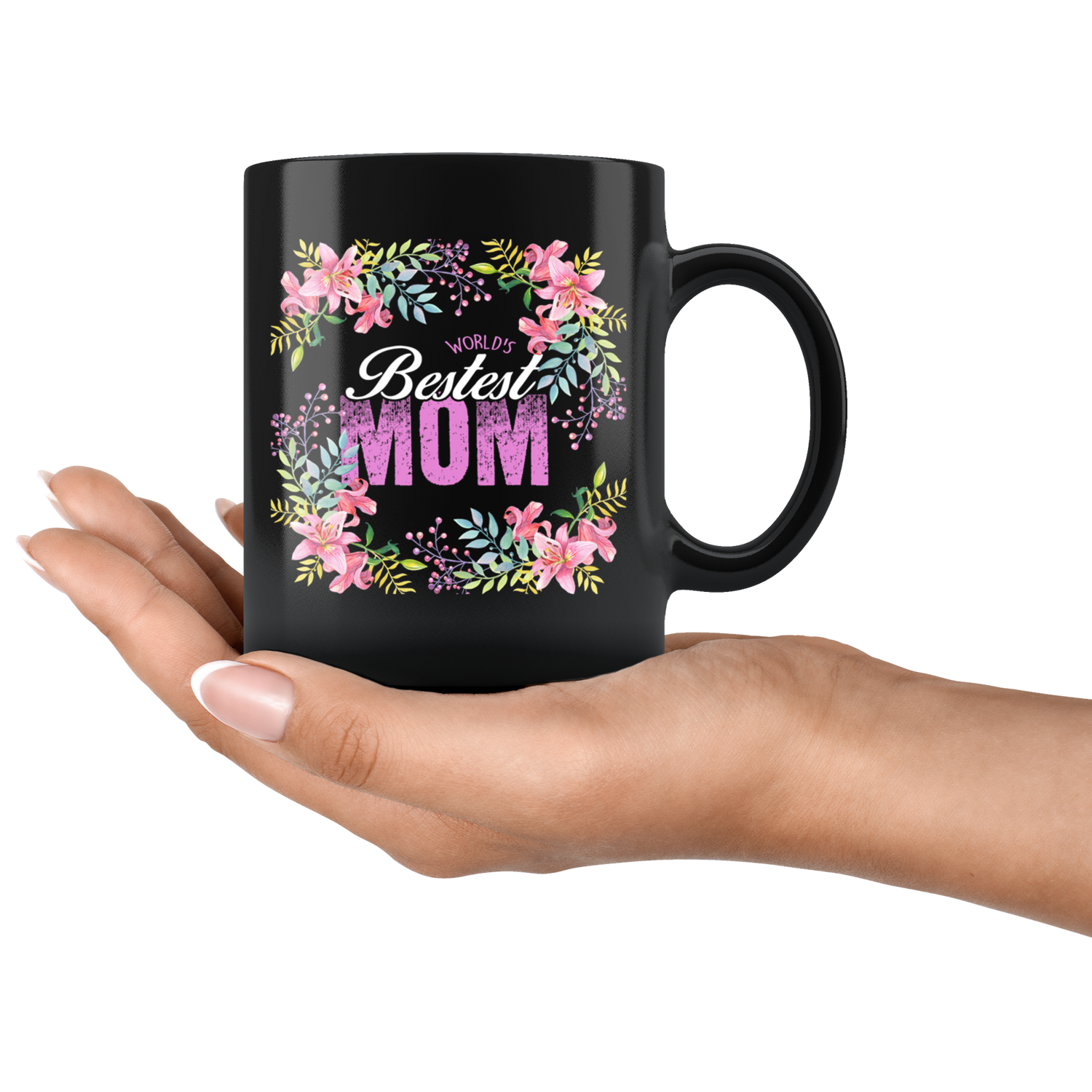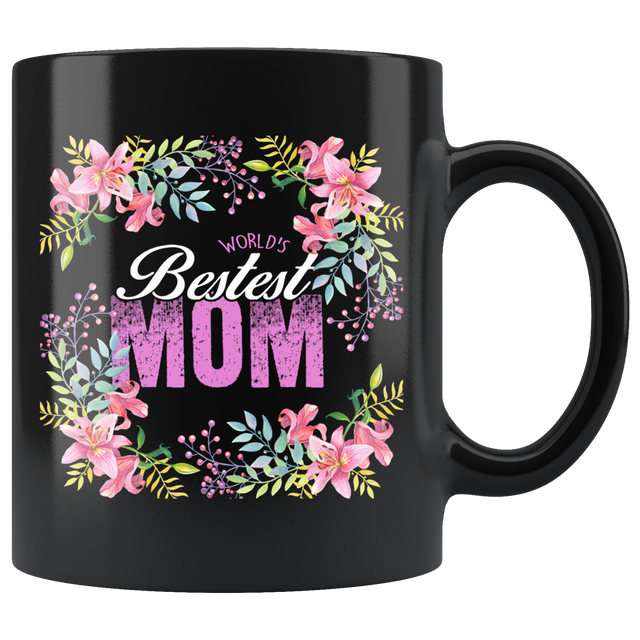 World's Bestest Mom in a Beautiful Flower Wreath is a Cute Fun Black Ceramic Coffee Mug and a Great Fun Gift for Mom for Mother's Day.
